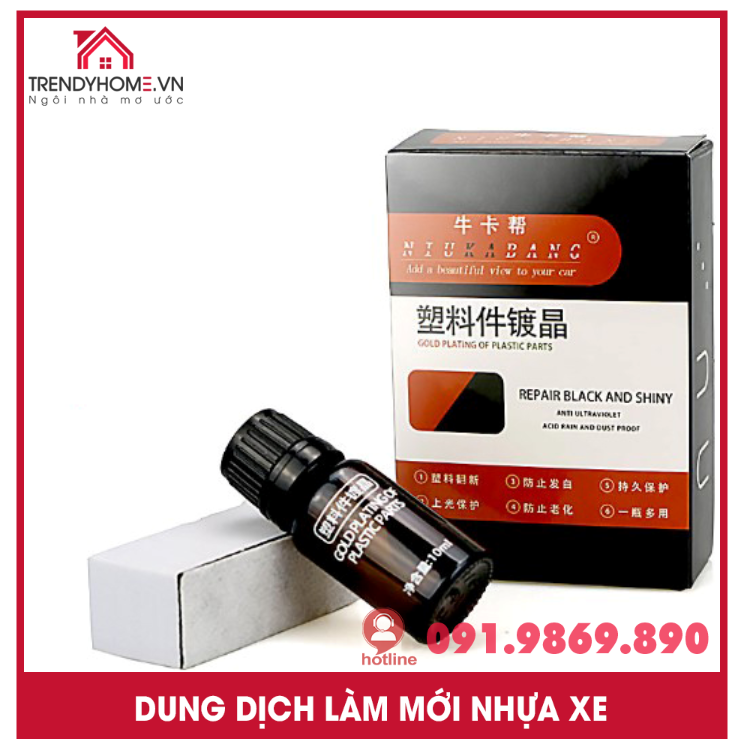 - Dung dịch phục hồi nhựa đen PLASTIC REMOVE không chỉ giúp các chi tiết nhựa nhám phục hồi lại màu đen thấm đều, sâu và tinh tế mà còn có tác dụng bảo vệ tránh lão hóa, bạc màu đến sáu tháng.