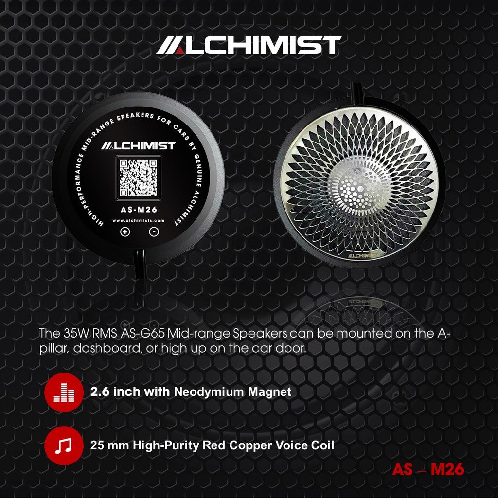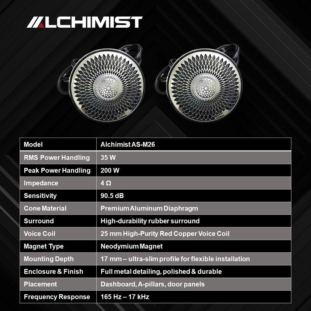 Được thiết kế dành riêng cho những hệ thống âm thanh xe hơi đòi hỏi độ chính xác cao, Alchimist AS-M26 là sự kết hợp hoàn hảo giữa kỹ thuật chế tác tinh xảo và hiệu suất âm thanh vượt trội. Với khả năng tái tạo dải trung và cao một cách rõ nét, loa mang đến trải nghiệm nghe nhạc sống động, giàu cảm xúc và đầy chiều sâu