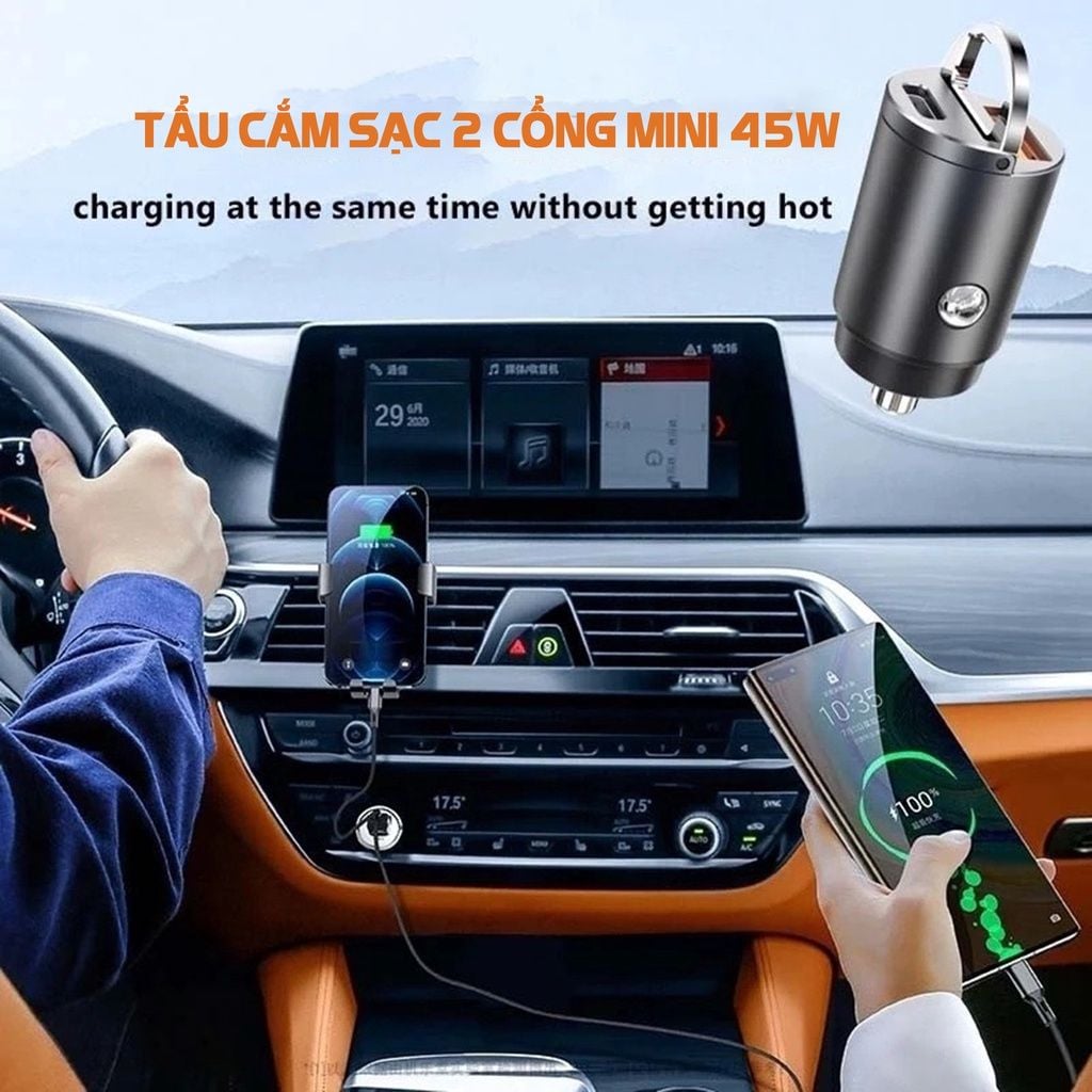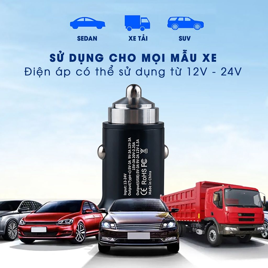 Tẩu Sạc Nhanh Hai Cổng Qc USB 3.0 Và Type C Pd 45W Cho Điện Thoại, máy tính trên xe ô tô điện 12V hoặc xe tải 24V